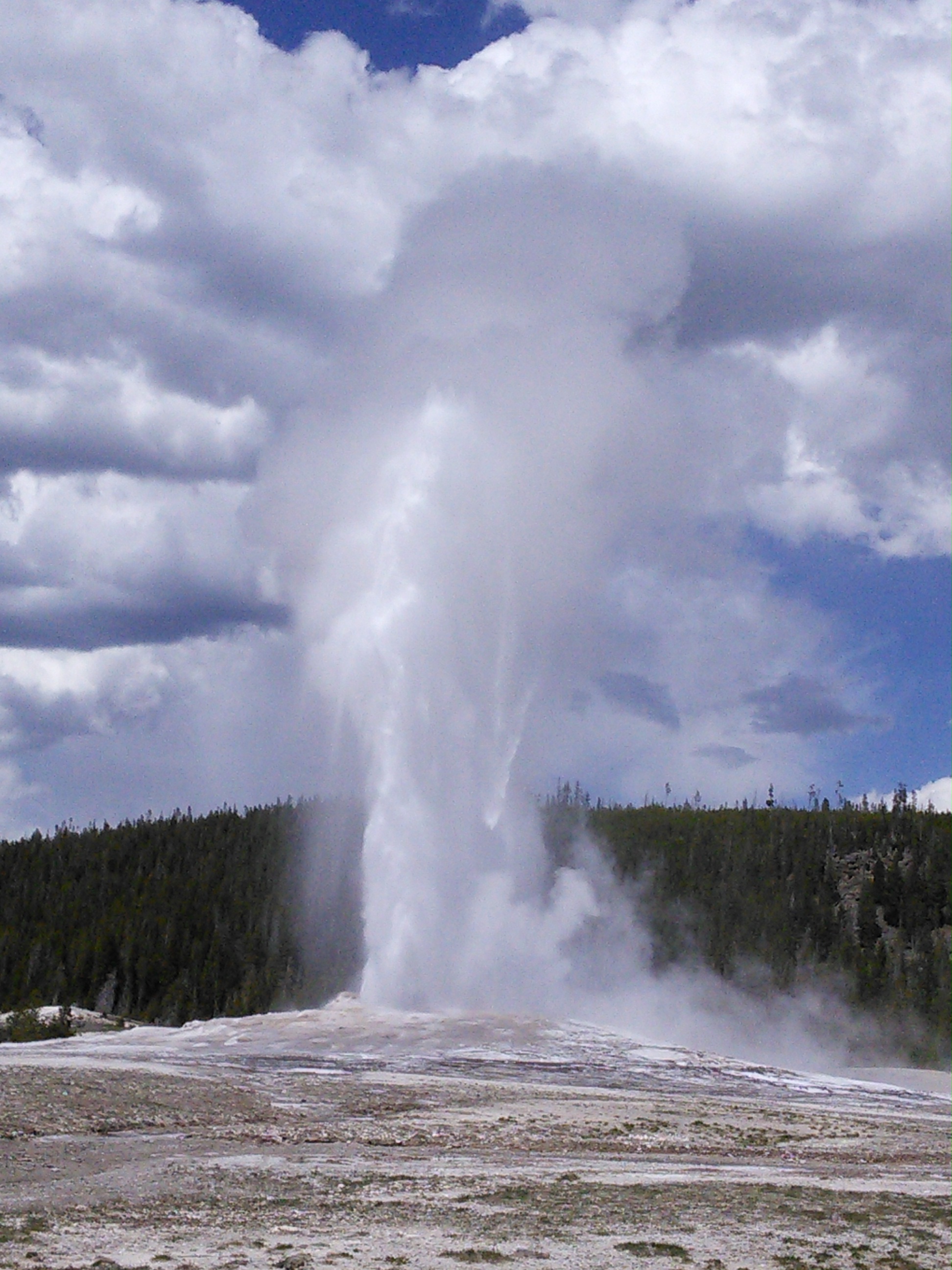Friday we visited Yellowstone. Very fun! Bunny had been there 40 years ago (insert senior citizen joke here). Old Faithful is still doing his (her?) thing. We waited with the throngs and watched the performance, then got some Moose Tracks ice cream and sat in Adirondack chairs watching the scenery. 🙂