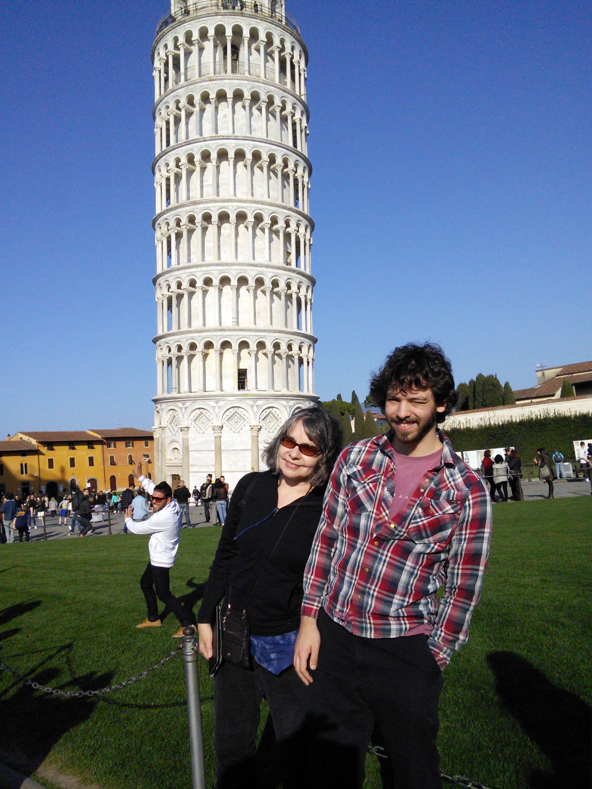 Then we walked around Assisi and ran into the most bizarre encounter of the trip yet. A couple dozen older men all dressed in white with (we kid you not) big white balloons on their heads were walking down the center of the street (small hill town street) They also had two or three white convertible cars with them and a couple of loudspeaakers – over which they played the themes to Star Wars and 2001: A Space odyssey. They eventually marched down the street in a sort of parade, saying something in Italian overr the speakers. We could not understand a thing but it was hilarious, truly. One of them held Flat (actually Creased Benjamin) up so we could snap a picture (see photo).All of thse guys were at least 65 or older and they all seemed to be having a good time. We’re just not sure if there was a point to the whole thing. If you find anything on the Internet that would explain this bizarre occurrence, let us know.